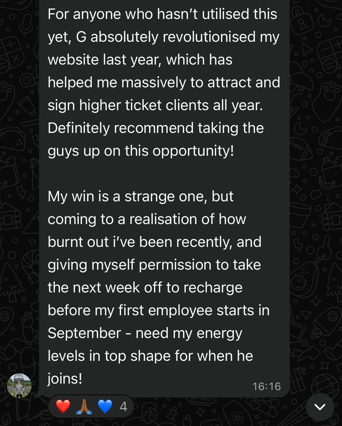 “Honestly, having G is like a second brain in my business — someone who helps me prioritise, stay accountable, and actually move forward every single week.”